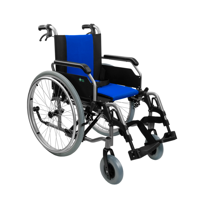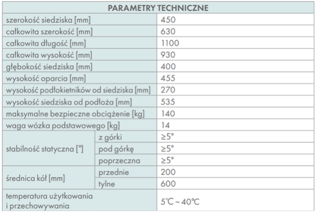 - Odchylane podnóżki z regulacją wysokości – ułatwiające wsiadanie i wysiadanie z wózka oraz dopasowanie do pacjenta.
